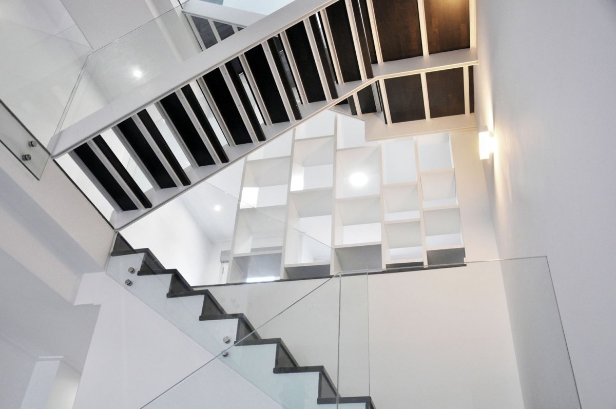 En planta primera encontramos el estudio que comunica con la doble altura, pero a través de un filtro para aumentar su privacidad. Las habitaciones, por su lado, se cierran a este vacío que recorre la vivienda como un fluido.